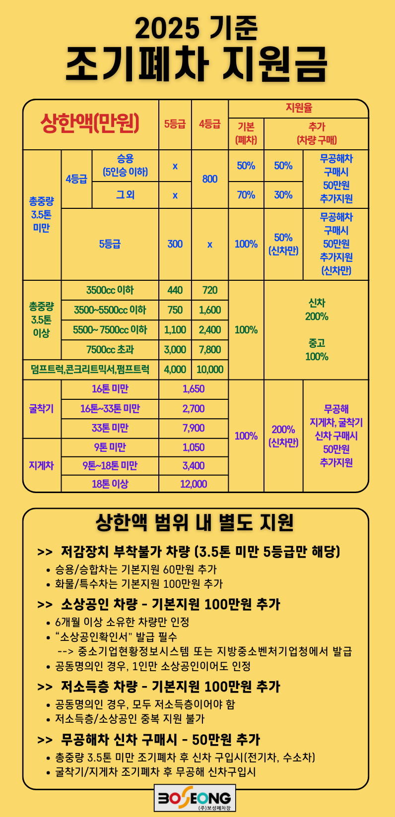 - 기본보조금: 보험개발원이 산정한 차량 기준가액에 지원율을 곱해 산정. (전국 동일 기준, 지자체나 폐차장이 금액에 관여할 수 없음)